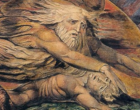 For Blake the God of the Old Testament was a false god. He believed the Fall of Man took place not in the Garden of Eden, but at the time of creation shown here, when man was dragged from the spiritual realm and made material.