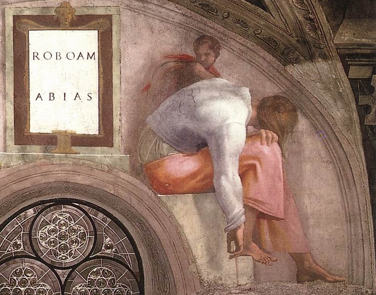 Many of Blake’s works are inspired by engravings he saw of the Sistine chapel ceiling. The pose of Newton is taken from the Lunette depiction of Abijah, one of the Michelangeo’s ancestors of Christ.